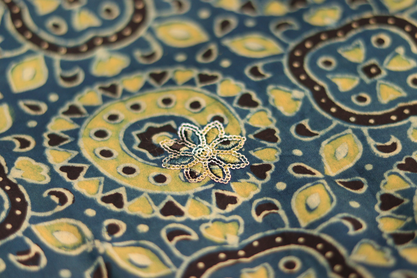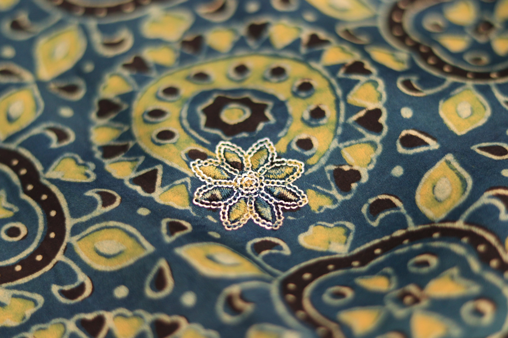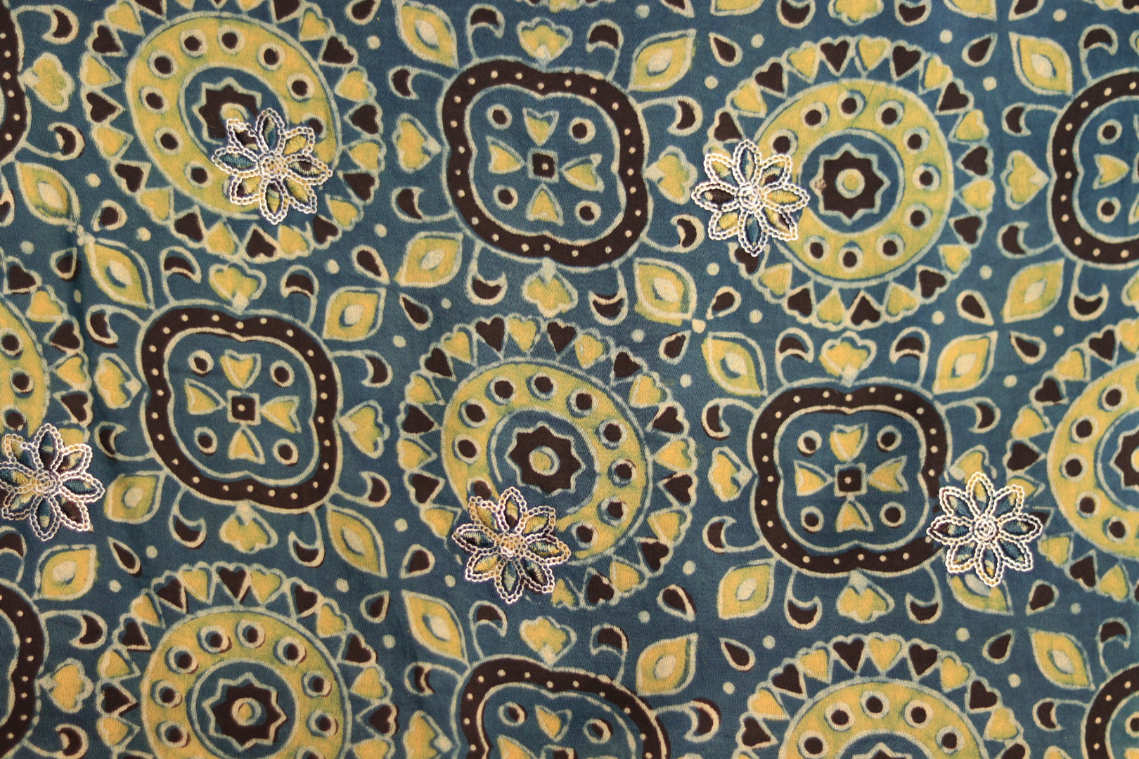 Ajrakh Print Hand-Embroidered Modal Fabric – Blue Elegance
