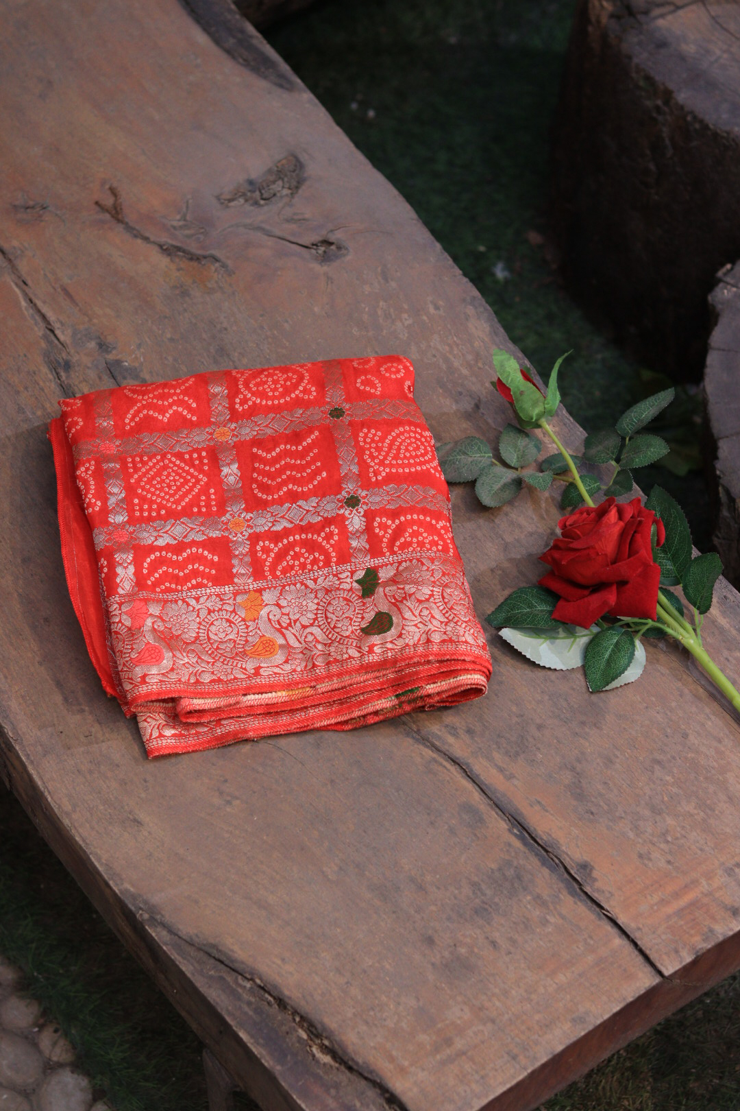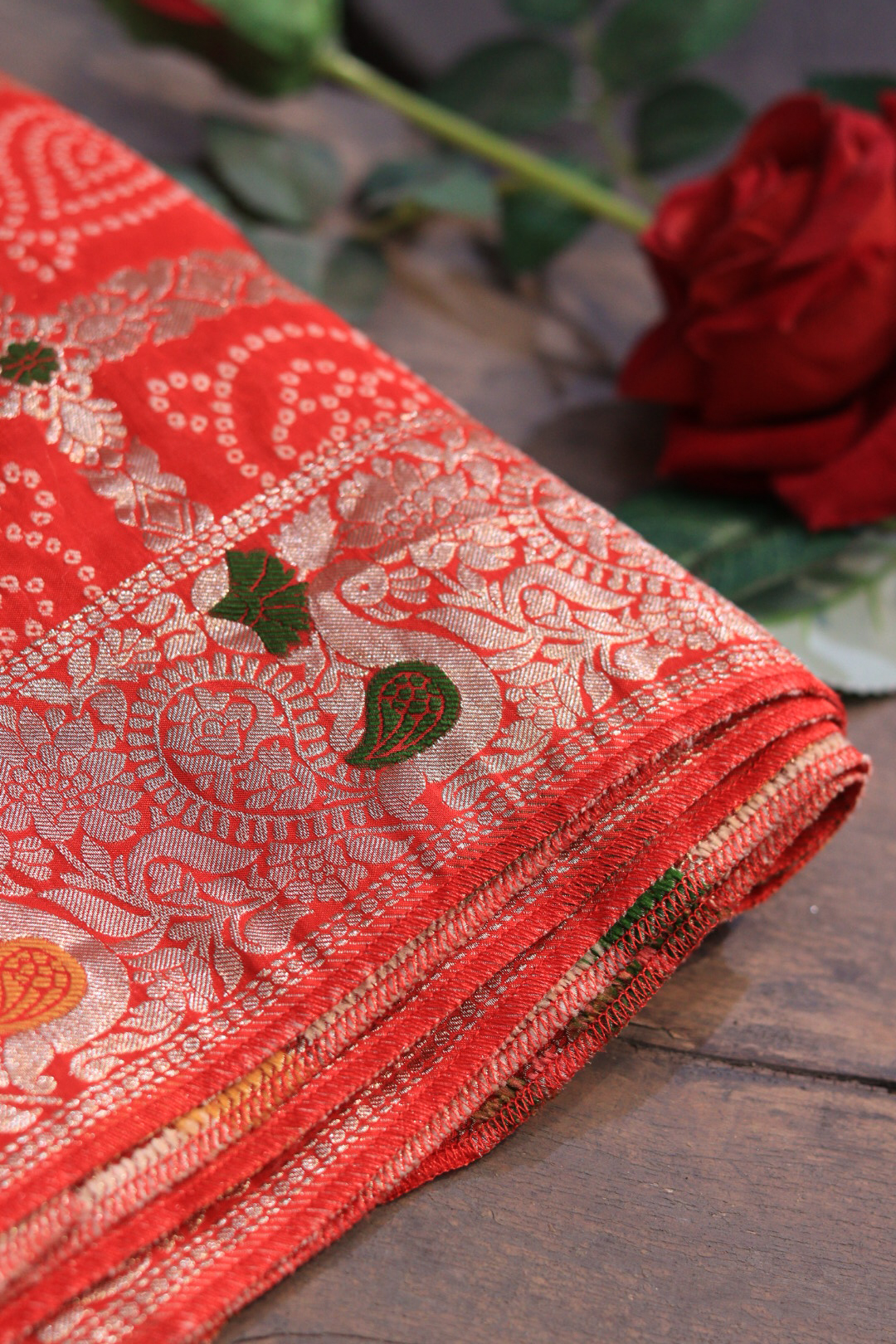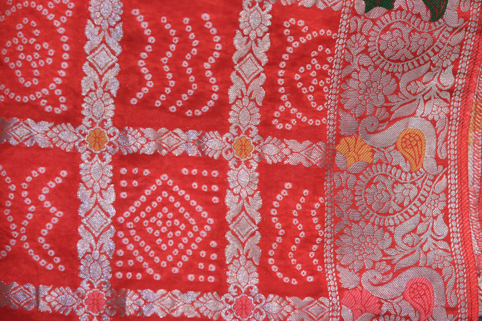 Design: Traditional Bandhej with a heavy hand-embroidered border.