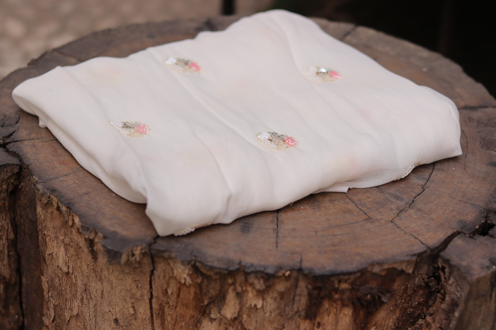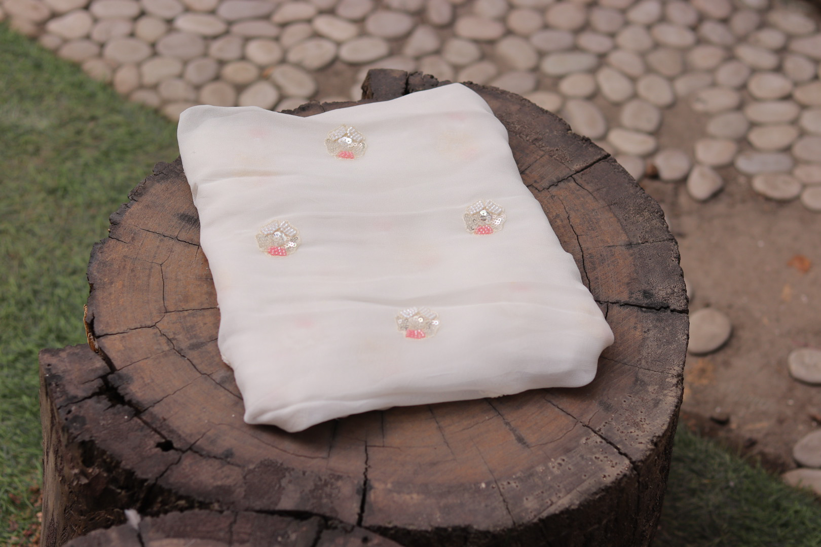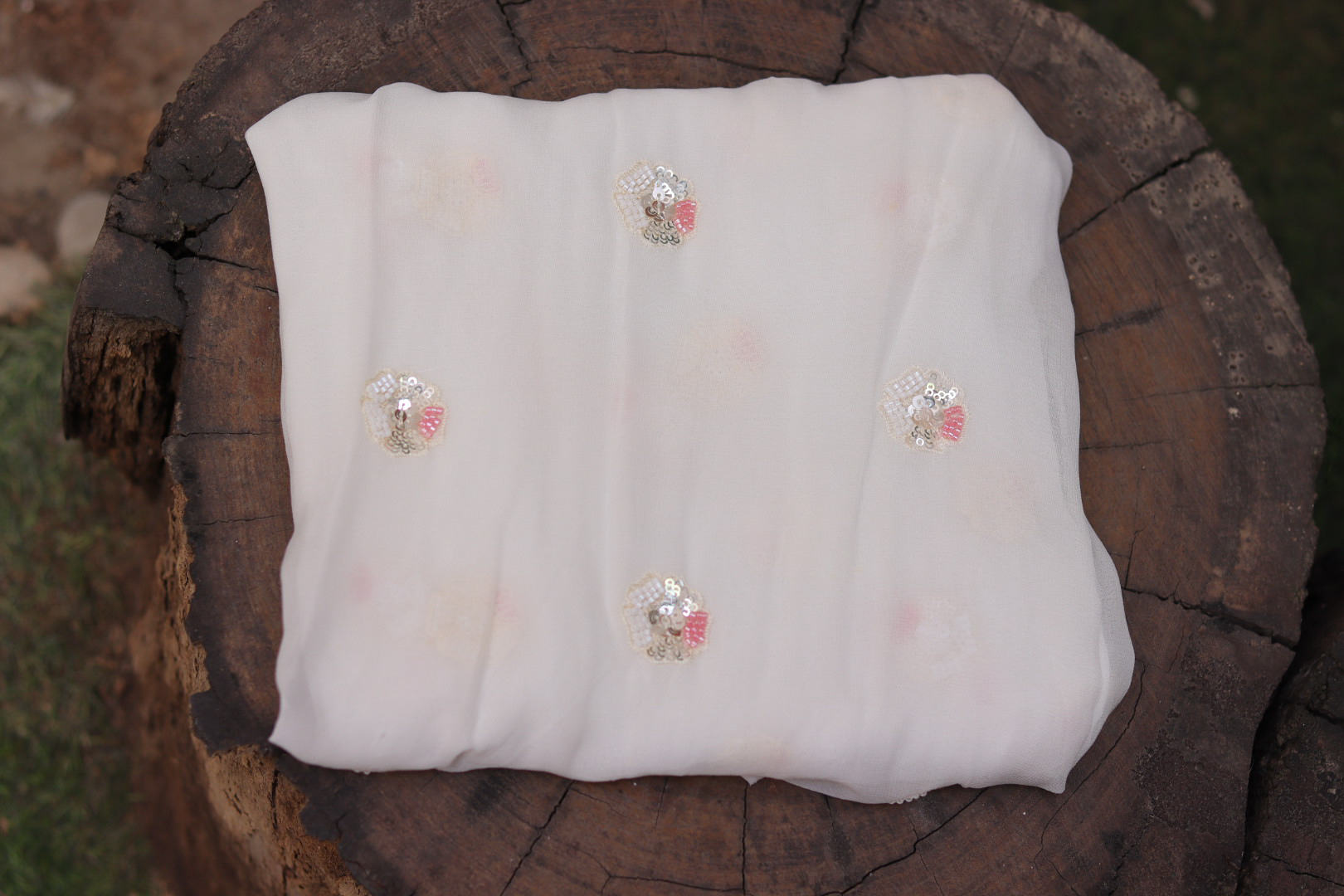 Premium Georgette fabric featuring delicate hand embroidery on a dyeable base, perfect for creating elegant ethnic and designer ensembles.