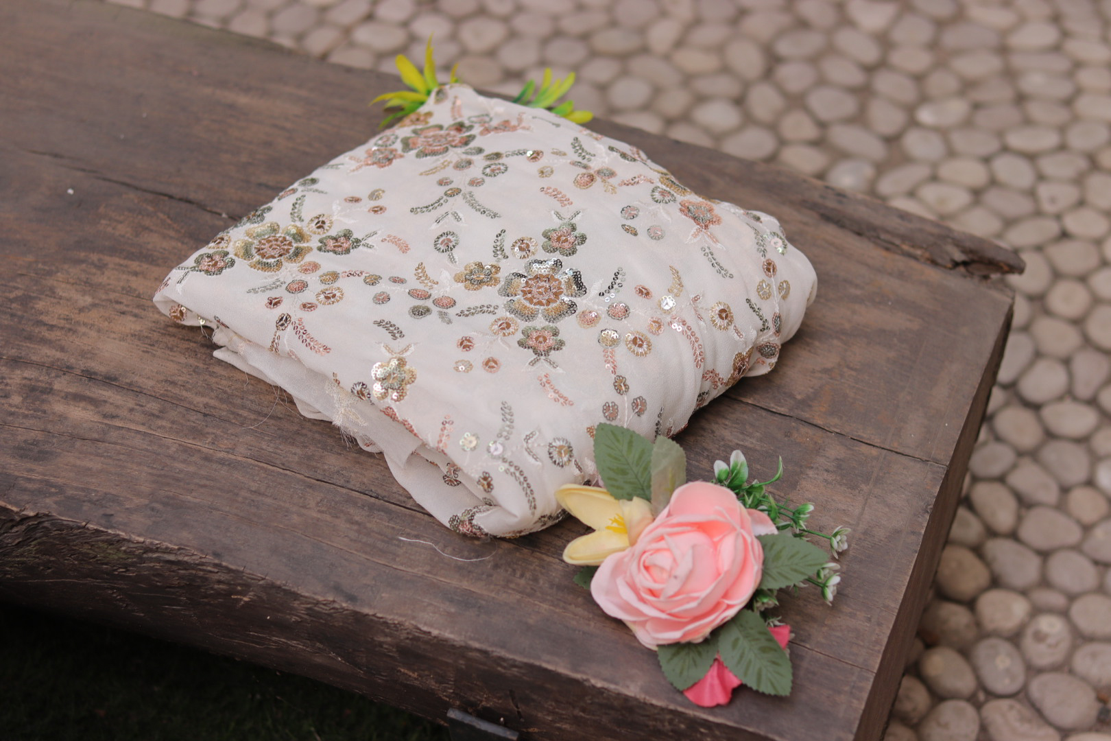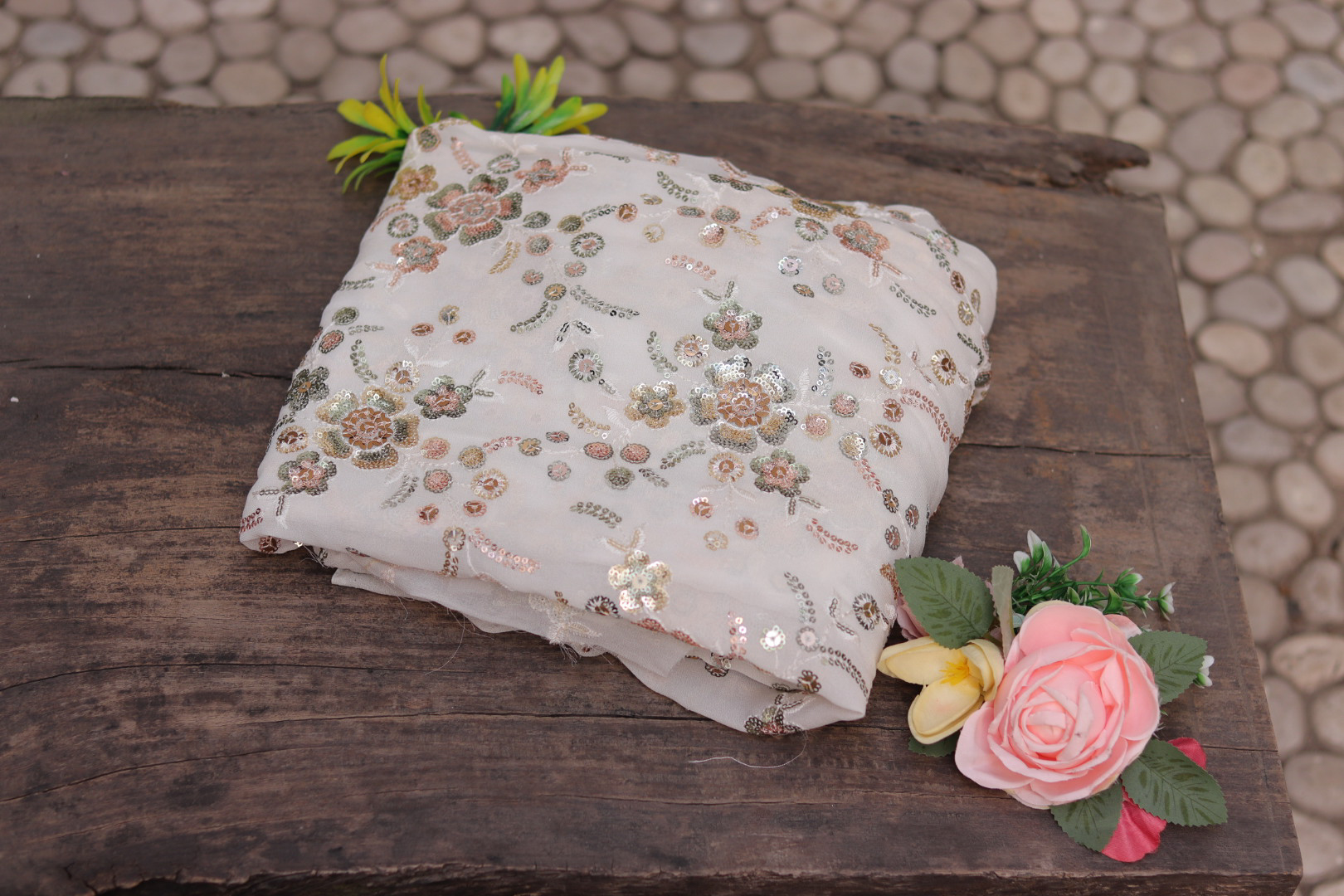 Discover the charm of traditional craftsmanship with this Dyeable Hand Embroidered Georgette Fabric. Made from premium-quality georgette, this fabric features intricate hand embroidery that adds depth, texture, and artistry to your creations.