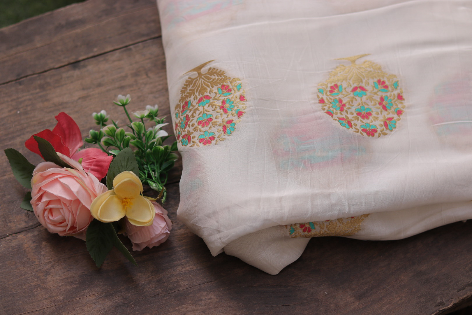Elegant silk fabric featuring intricate self-weaving embroidery on a dyeable base, ideal for creating luxurious and personalized designer wear.