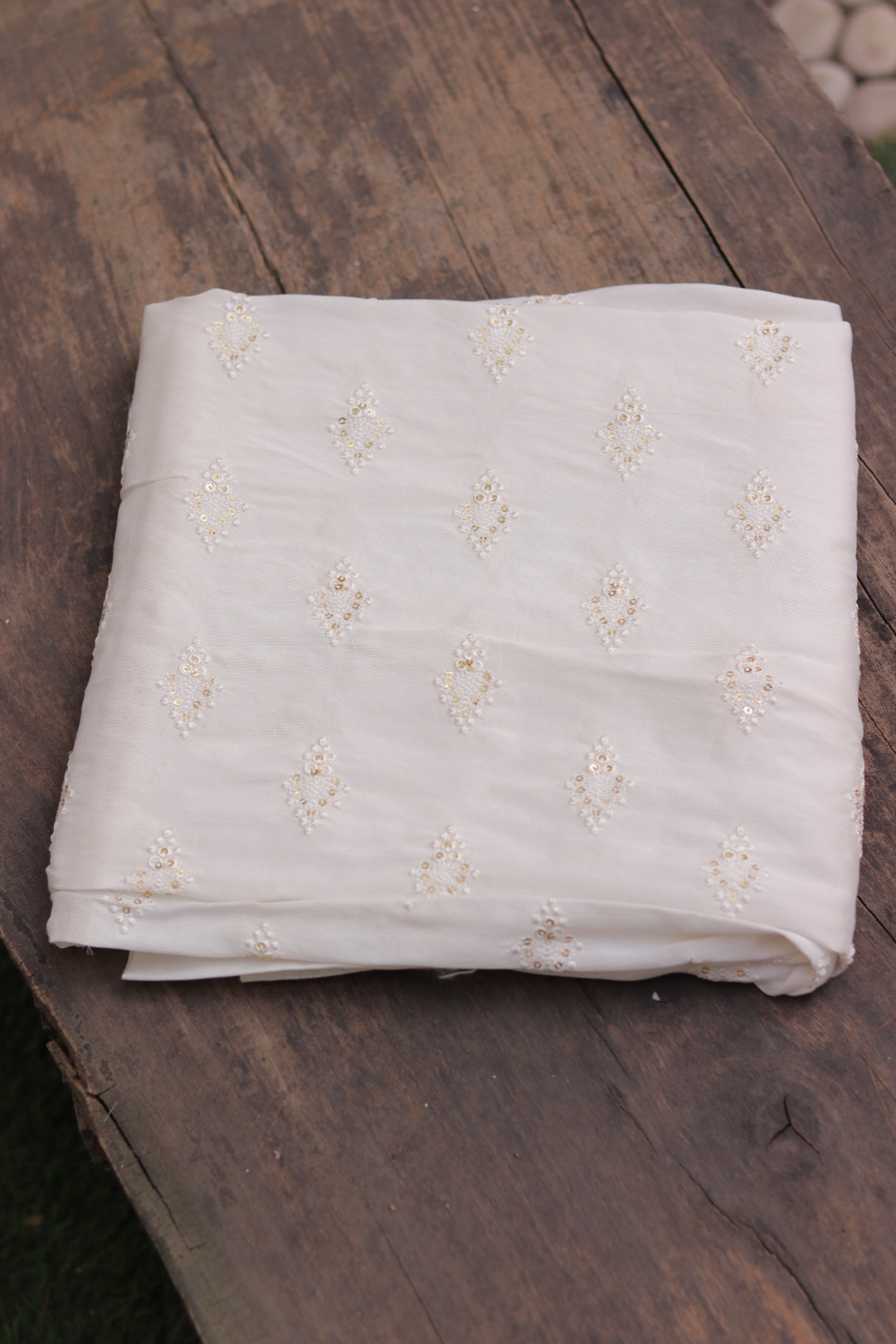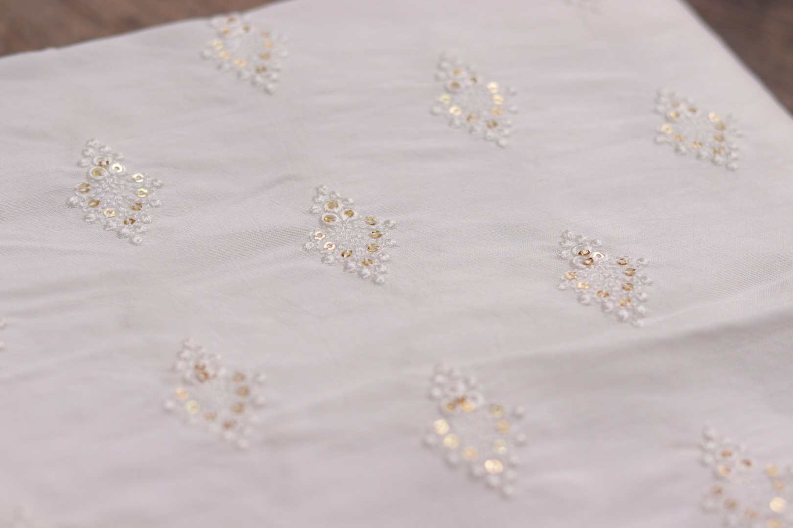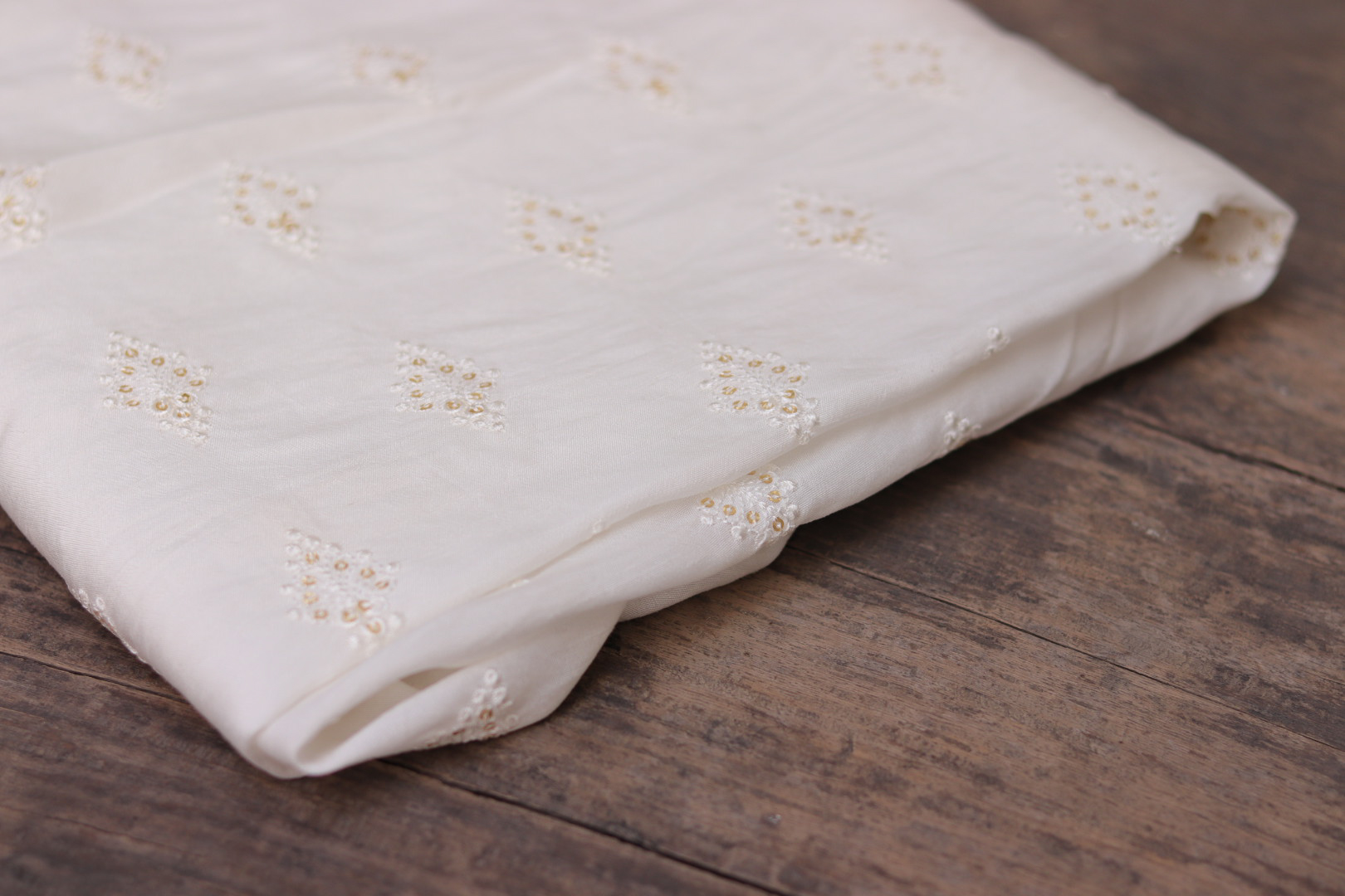 Soft and elegant Chinon fabric featuring delicate thread work embroidery on a dyeable base, ideal for creating custom-colored ethnic, bridal and designer outfits.