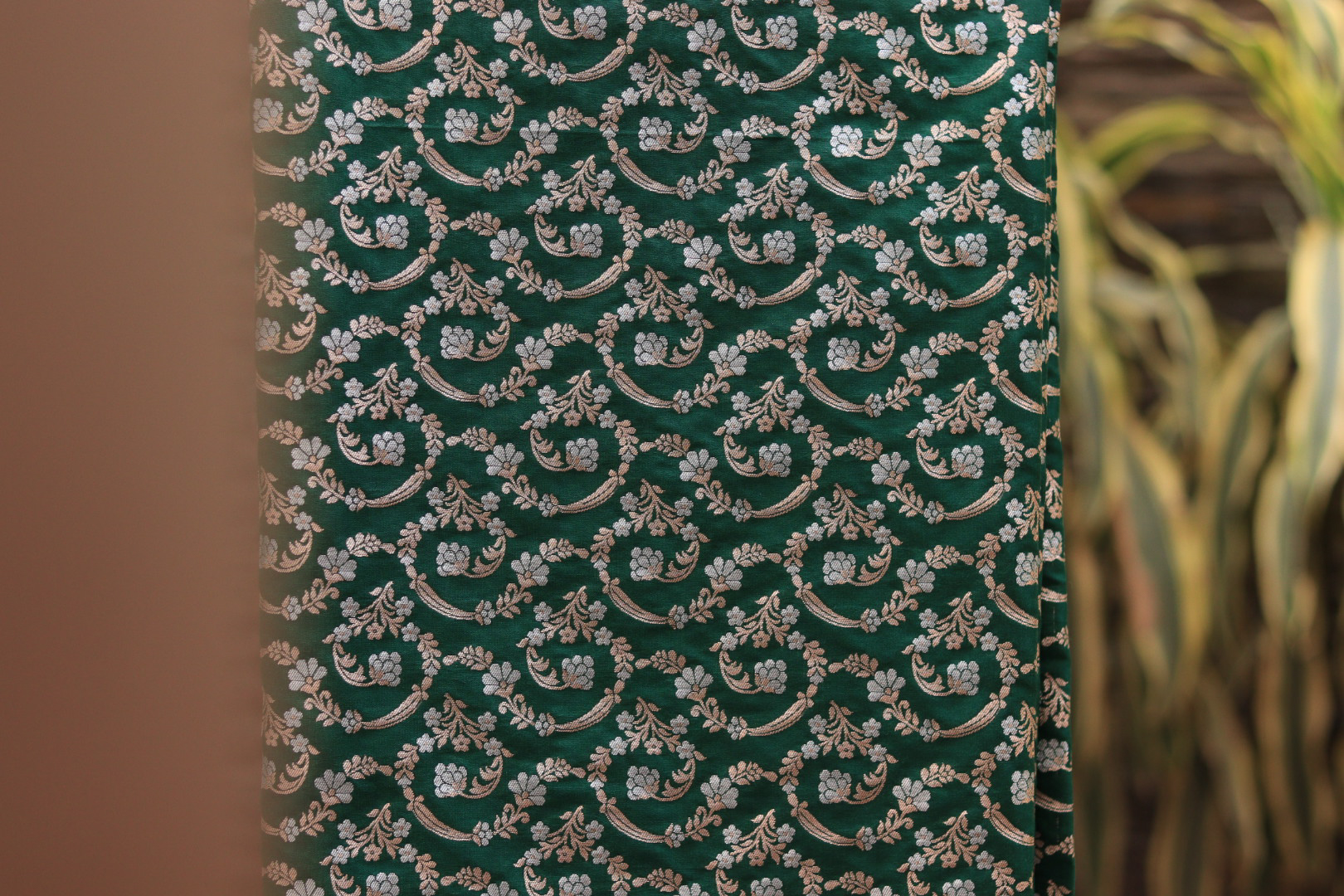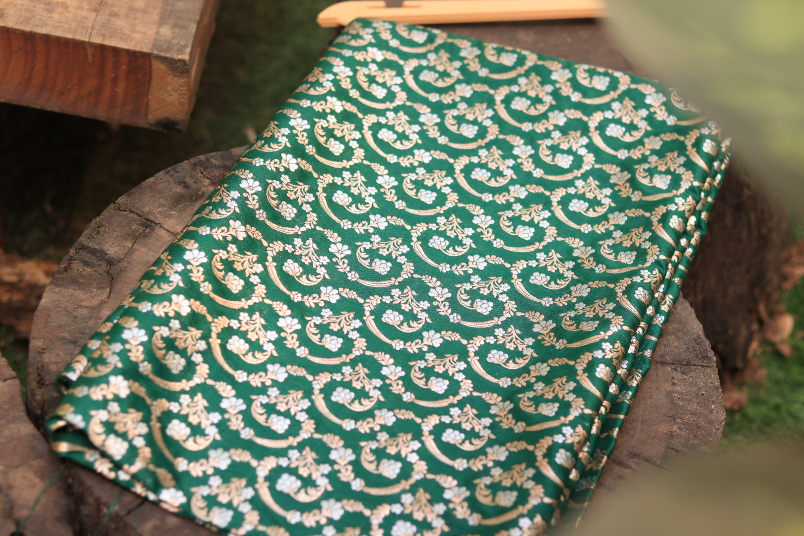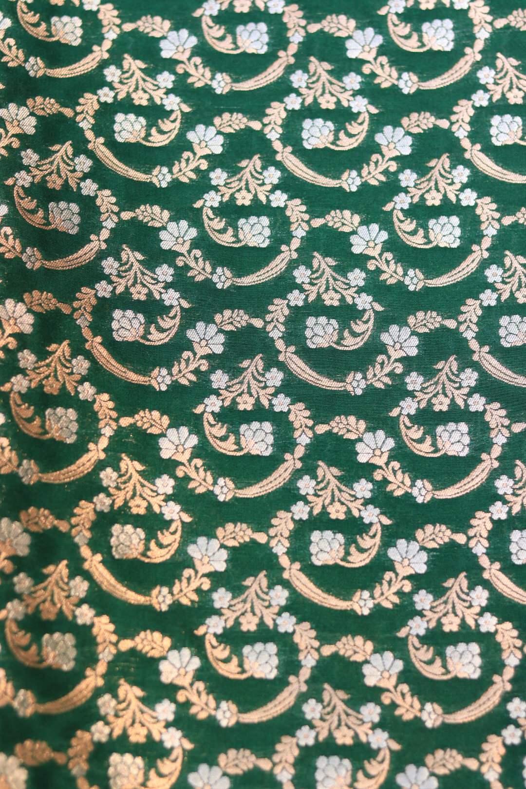 Rich and luxurious green brocade silk fabric with intricate woven patterns. Ideal for creating ethnic wear, festive outfits, and designer ensembles.