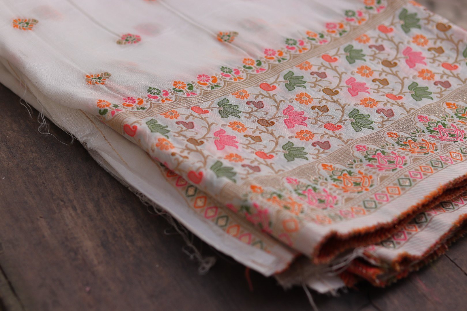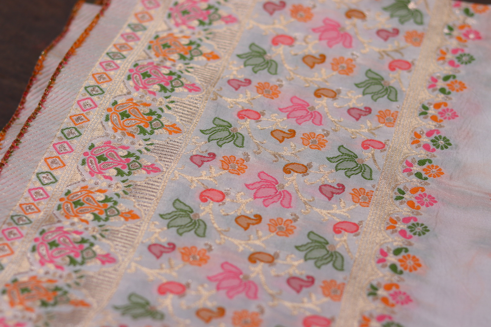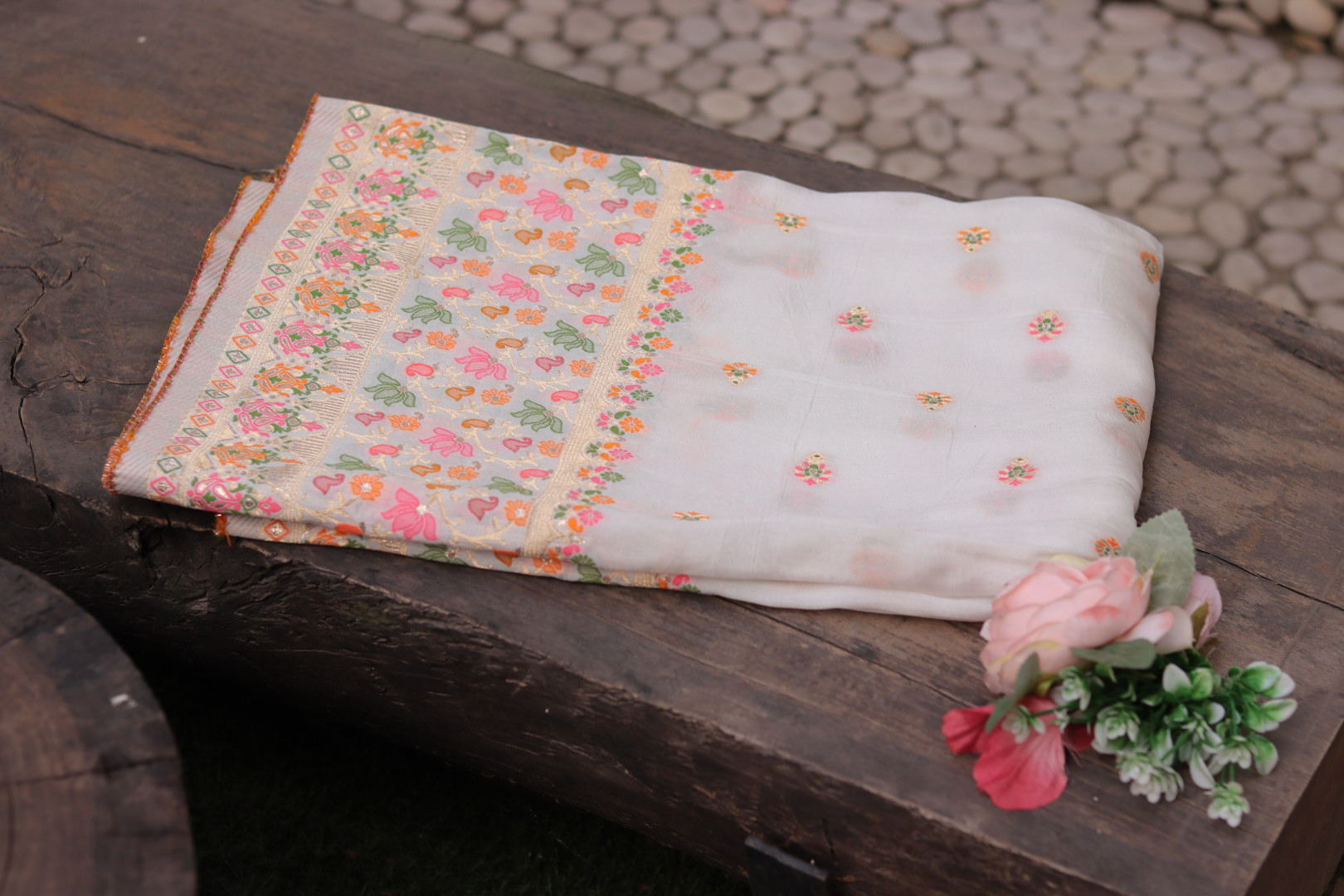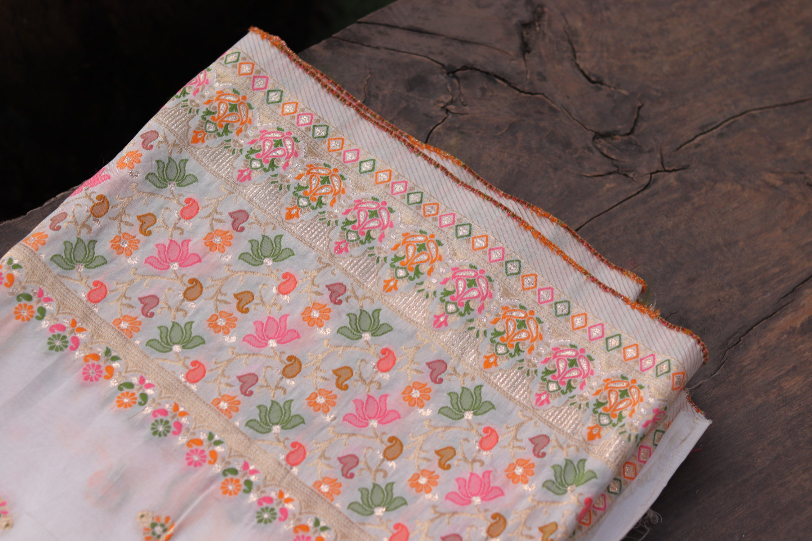 Elegant Pure Silk Dupatta with delicate embroidery on a dyeable base — perfect for creating personalized shades. Soft, luxurious, and ideal for festive or designer wear.