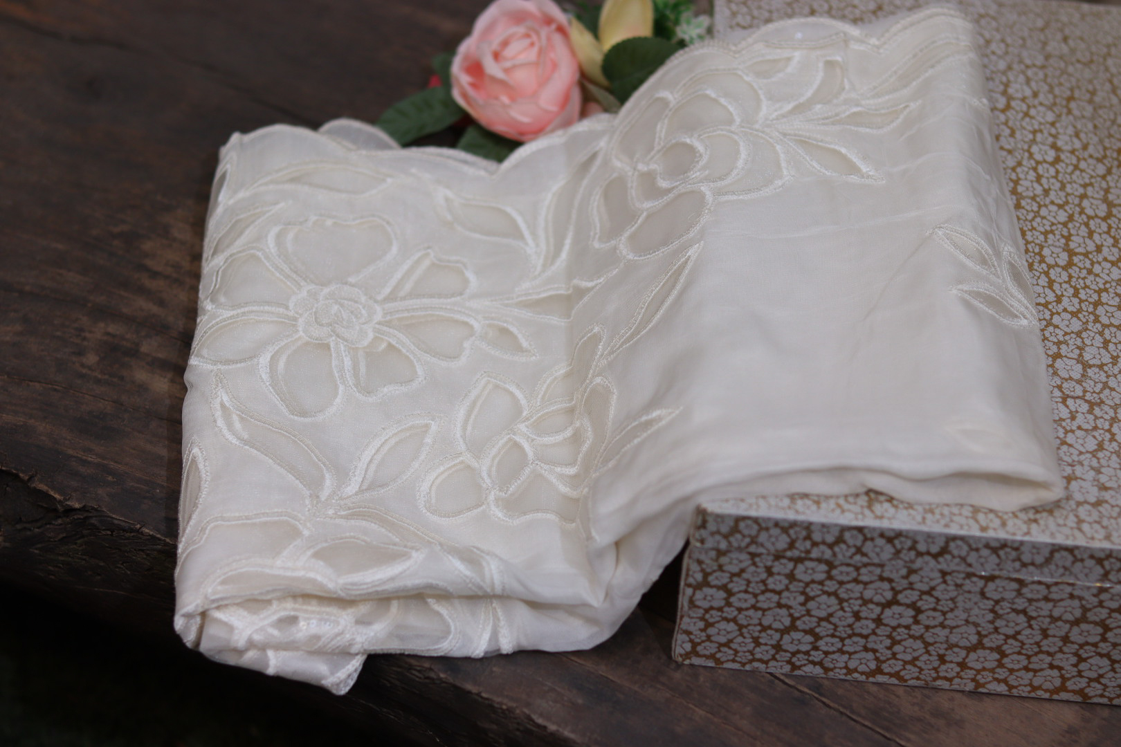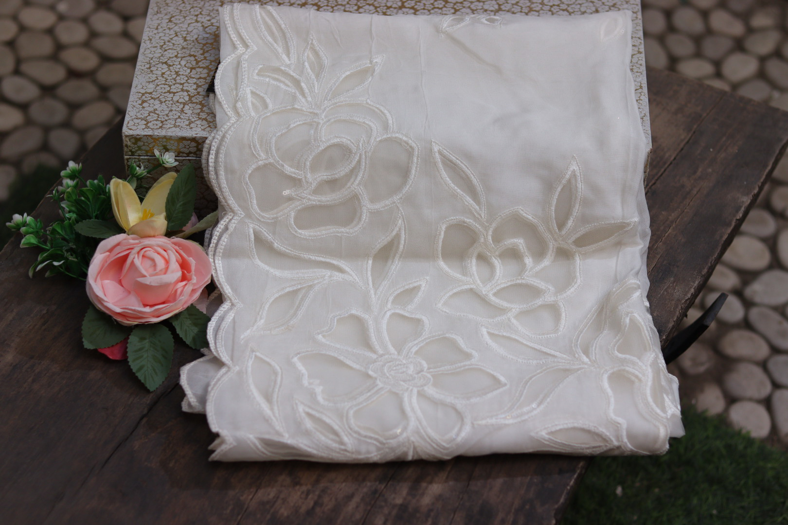 Rose Cutwork Heavy Tissue Dupatta – Dyeable Elegance