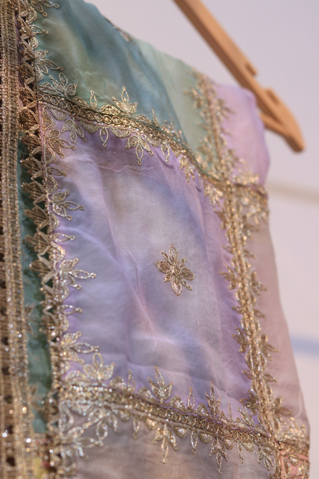 A luxurious tissue dupatta adorned with beautiful multicolor hand embroidery in soft pastel tones. Lightweight, shimmery, and perfect for festive or wedding wear.
