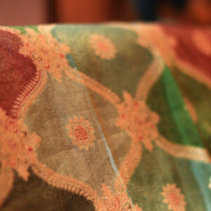 Rich and luxurious green brocade silk fabric with intricate woven patterns. Ideal for creating ethnic wear, festive outfits, and designer ensembles.